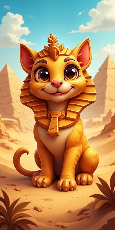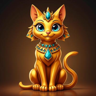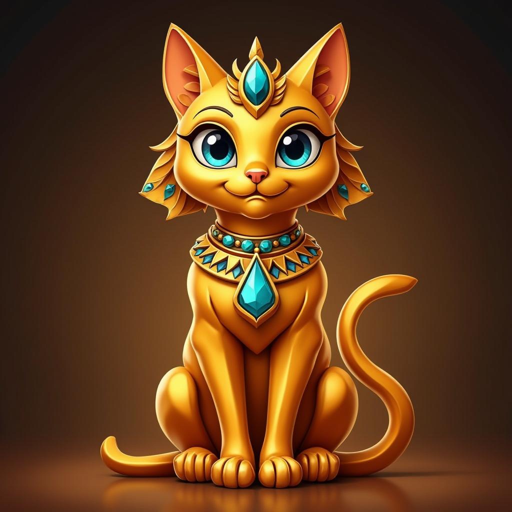 Мультяшный значок для слот-игры в виде золотой статуэтки египетской кошки. Сидящая фигурка в стиле Бастет, сделанная из золота, как декоративная скульптура. Обязательно подчёркнуты материал и текстура — блестящее золото, ювелирные украшения из бирюзы и сапфира, декоративное ожерелье. Стиль объёмный, как маленькая фигурка-амулет, с мягкими тенями и бликами. Фон прозрачный, чтобы использовать как символ на барабане.