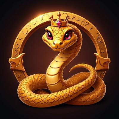 Иконка золотой кобры для слот-игры в древнеегипетском стиле. Кобра свернулась кольцом, голова поднята, с короной и рубиновыми глазами. Тело украшено орнаментом, блестит мягким золотым сиянием. Стиль 2D, мультяшный, яркий, без реализма, с чёткими формами и плавными тенями. Вокруг головы лёгкое сияние, мягкий ореол света. Прозрачный фон, символ силы и защиты, подходит для роли Wild.