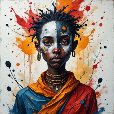 АБСТРАКЦИЯ В данной работе исследуется абстрактная живопись, созданная в стиле картин Ilene Meyer И Roberto Ferri, которая демонстрирует КОМПОЗИЦИЮ ДО ПОЯСА В ШАМАНСКОМ КОСТЮМЕ БОЛЬШЕГЛАЗОЙ КОРОТКОВОЛОСОЙ АФРИКАНКИ НАЛИТОЙ БЕЛОЙ КРАСКИ С КЛЯКСАМИ И ПОТЕКАМИ , МНОГОЦВЕТОЧНОЙ КОМПОЗИЦИИ В ВИДЕ переплетения БЕЛО-МРАМОРНОЙ ГИППЕРРЕАЛИСТИЧНОЙ ВЕКТОРНОЙ ГРАФИКИ , фигур и объектов СЕРАЯ, КРЕМОВАЯ , МРАМОРНАЯ, СВЕТЛО ТЕРРАКОТОВАЯ, ОХРОВАЯ, ОЛИВКОВАЯ ПАЛИТРЫ, намекая на борьбу с ЖЕНСКИМ подсознанием сюжета. Работы представлены в сюрреалистической перспективе, иллюстрируя полет, вызванный генерацией подсознательной сублимации сознания, в реконструкцию переосознания реальности в ином измерении.,,,