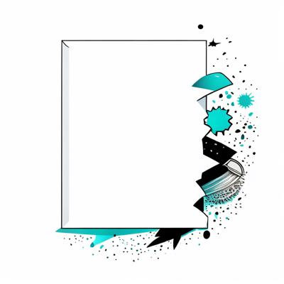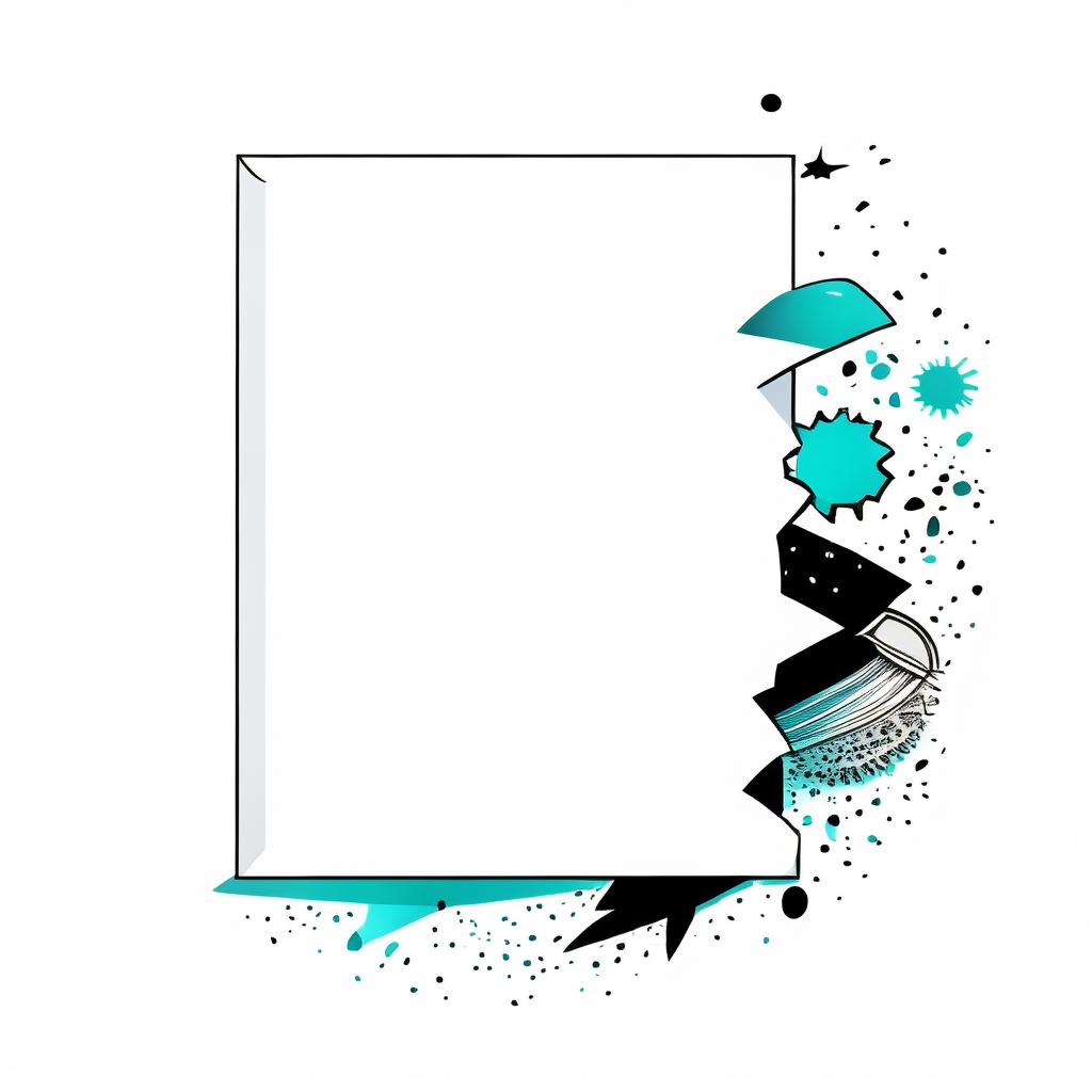 Чистый лист, - В правом нижнем углу — *рваная дыра* с «неровными» краями , - Из прорыва *выходят элементы*: , - Кисть , - Киноплёнка, - Шестерёнка, - Цветовое пятно , Цветовая палитра:, - Основной: *Белый лист угольно-чёрный текст* , - Прорыв: *Яркие акценты* (бирюзовый, малиновый, золотой)