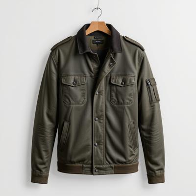 Куртка, смесь военной m-65 и байкерской косухи, смесь бренда stone island и enfant rich deprimes без человека, куртка весит на вешалке на белом фоне., Должно быть более авангардным совмещая дух маргинализованной богемы и технологичность., Материалы должны быть необычными, как сочетание грубой кожи и балестического нейлона., Куртка должна быть сверхреалистичной