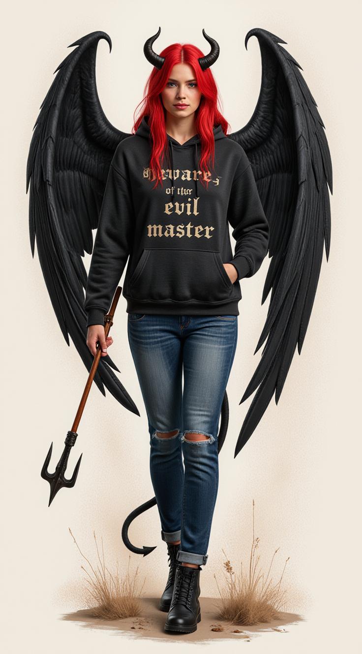 Эскиз для вышивки на толстовке. Девушка ангел с рыжими волосами, чёрные крылья, демонический хвостик не как у животного с треугольничком на конце, рожки, в руке трезубец. демоническая ухмылка. Надпись "Осторожно злой хозяин" латинский алфавит, начало сверху продолжение снизу. В руке поводок от ошейника собаки который прицепелен к ошейнику собаки, рядом собака сидит породы хаски русого оттенка. Одета в короткий топик и шорты. Вызывает страх. Подогнано под возможности вышивки на швейной машинке.