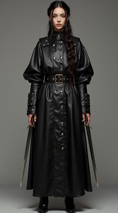 женщина, темные густые волосы собраны в прическу из плетеных кос, шикарные формы, объемная простая одежда, большая мужская куртка из грубой кожи, заклепки ремни пряжки, высокий ворот, средневековый стиль одежды, кинжалы в двух руках, в полный рост, фотореализм, гиперреализм, высокая детализация, общий план, вид из далека,