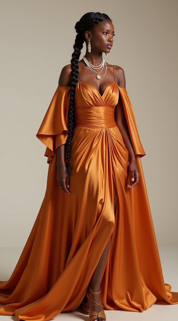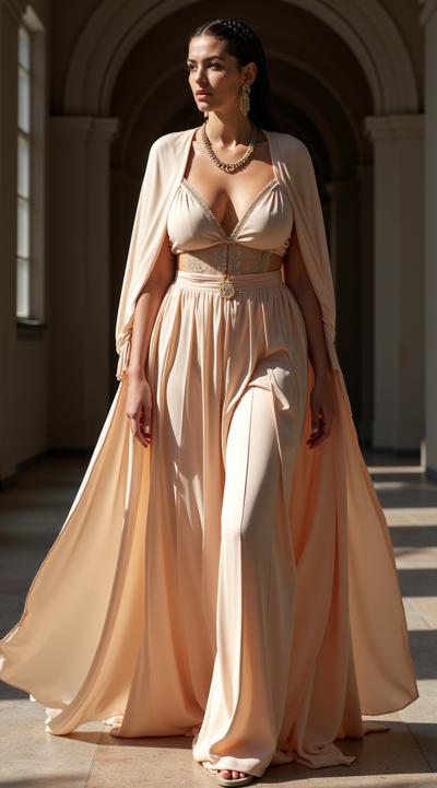 красавицы: пробуждение моды, дизайнерский образ, высокая мода 2000х, большой бюст(мегамастия), шикарные бедра, богатая одежда, струящиеся ткани, темные волосы собраны в плетеную причёску, облаченная в светлые длинные одежды, развевающимися накидками, украшения из драгоценных металлов, нитки жемчуга, бахрома из блестящих тонких цепочек с кристаллами на плечах руках, русский народный стиль, сарафан и плетеная повязка на голову, в полный рост