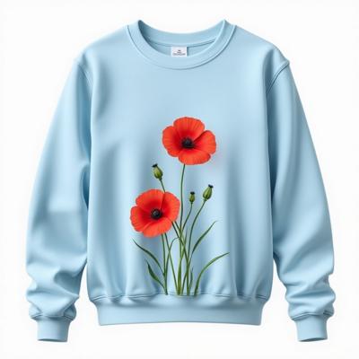 Свитшот женский светло голубого цвета, впереди несколько веточек мака красный