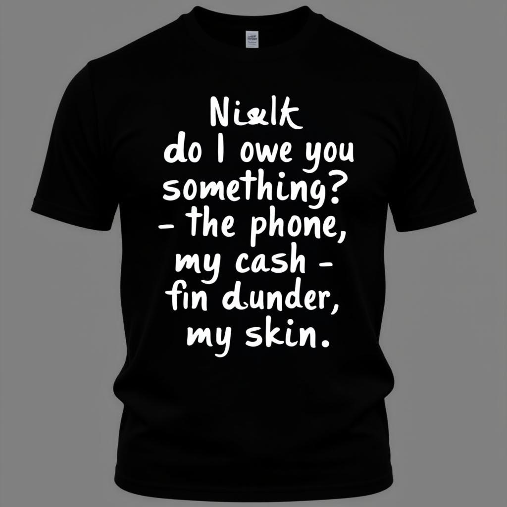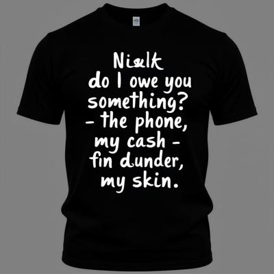 сделай картинку. напиши на черной футболке белым шрифтом текст каллигравией на русском языке: Ночь, я тебе что то должен?, Телефон, моя наличка и музыка под кожей В моем ДНК обнаружено что-то большее, Я не нравлюсь индустрии, она мне тоже, Новый сюжет, это новая глубина, Круиз контроль, как будто, я двигаюсь не cam, На пути к космосу на страже стоят небеса, Запомни меня таким, когда я не был звезда