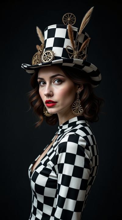 Очень реальная фотография, снята на камеру fujifilm X-T5. Снято в студии на темном фоне. Студийный свет. Портрет среднего плана до груди. Портрет женщины в одежде из шахматной ткани из крупных черно-белых состаренных ромбов с украшениями из шестерёнок в стиле стимпанк. Шляпа-цилиндр из шахматной ткани с рисунком из крупных черно-белых состаренных ромбов с украшениями в стиле стимпанк. Шляпа носит законченный характер сверху и полностью помещается в кадре. Супер фантазия. Элита, богема, манерность, мистика, красота. Гиперреалистичность, супердетализация, стиль vogue