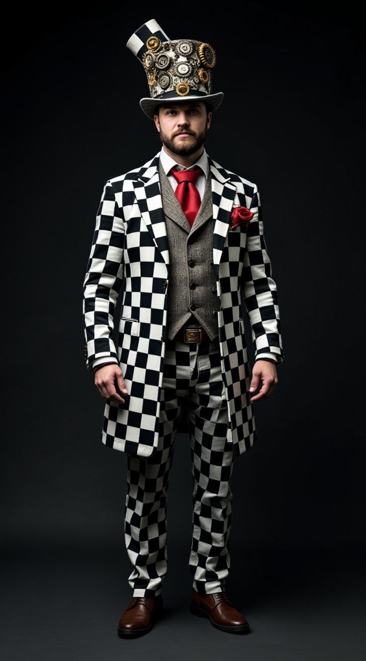 Очень реальная фотография, снята на камеру fujifilm X-T5. Снято в студии на темном фоне. Студийный свет. Портрет среднего плана до груди. Портрет мужчины в одежде из шахматной ткани из крупных черно-белых состаренных ромбов с украшениями из шестерёнок в стиле стимпанк. Шляпа-цилиндр из шахматной ткани с рисунком из крупных черно-белых состаренных ромбов с украшениями в стиле стимпанк. Шляпа носит законченный характер сверху и полностью помещается в кадре. Супер фантазия. Элита, богема, манерность, мистика, красота. Гиперреалистичность, супердетализация, стиль vogue