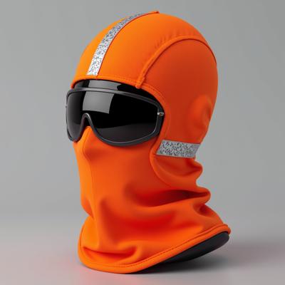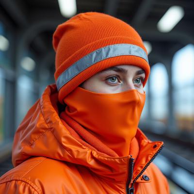 Сгенерируй зимнюю шапку со светоотражательной полосой для работников железнодорожного транспорта, чтобы была возможность носить каску, светоотражающая полоса должна быть вдоль всей длины шапки, цвет шапки оранжевый, добавь возможность носить её как балаклава, чтобы была возможность закрывать лицо зимой от холода