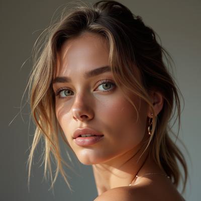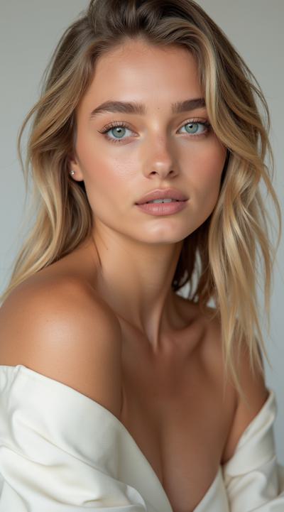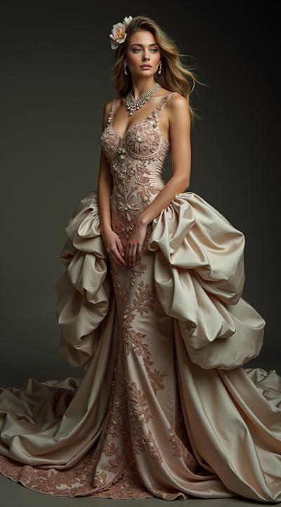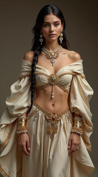 красавицы: пробуждение моды, дизайнерский образ, большой бюст(мегамастия), шикарные бедра, богатая одежда, струящиеся ткани, темные волосы собраны в плетеную причёску, облаченная в светлые длинные одежды, развевающимися накидками, украшения из драгоценных металлов, нитки жемчуга, бахрома из блестящих тонких цепочек с кристаллами на плечах руках, русский народный стиль, сарафан и плетеная повязка на голову, в полный рост
