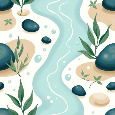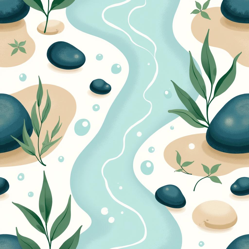 Seamless pattern, thermal spa resort, luxury wellness. Abstract water ripples, air bubbles, smooth stones, and minimalist fern leaves. Color scheme: serene aqua, warm sand, deep navy, sage green. Elegant, minimalist, flat vector illustration with subtle watercolor splashes. Spa aesthetic, sophisticated, for merchandise and packaging. --style raw