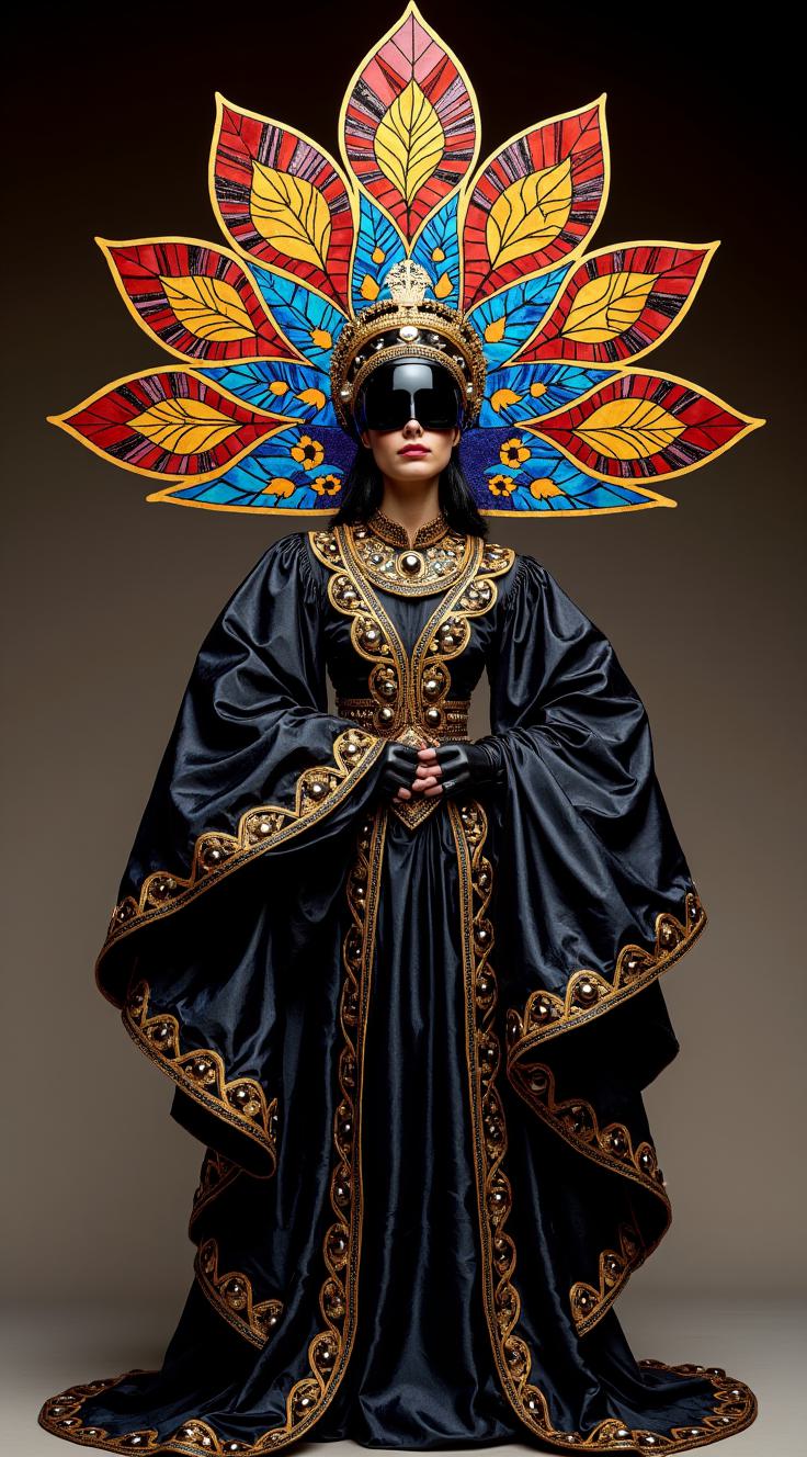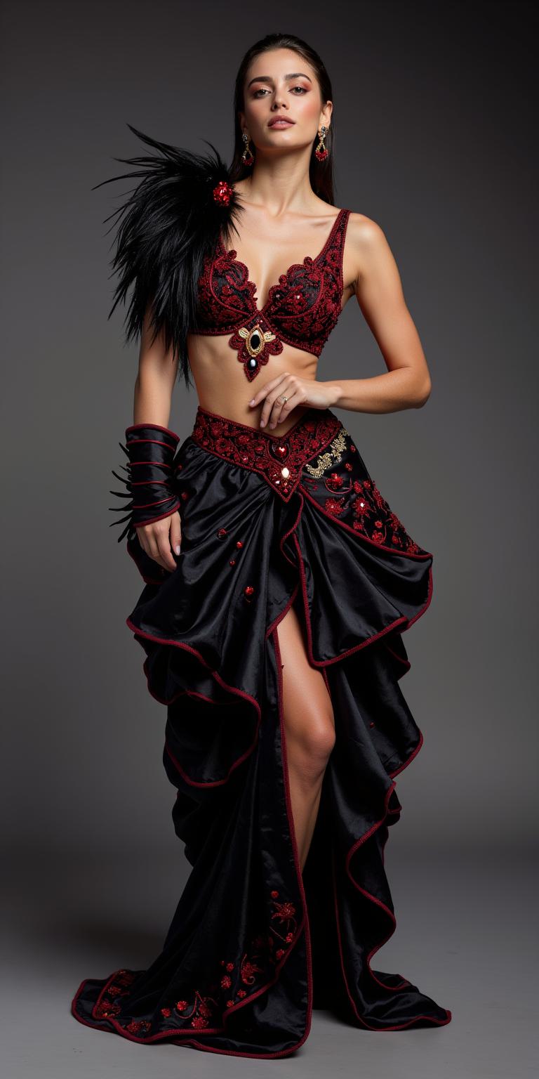 Full-body costume for a dancer. A stunning, asymmetric belly dance costume in a dramatic black and red color scheme. The top is made of sheer black mesh with intricate red embroidery and scattered red crystals. One shoulder is adorned with a cascade of black fringe and red sequins. The high-waisted skirt is made of flowing red silk on one side, and sheer black mesh with a dramatic slit on the other, edged with more black fringe. The costume is richly decorated with Swarovski crystals and silver beads, blending elements for tabla solo and Argentine tango. Dynamic pose, studio lighting, photorealistic, high detail.
