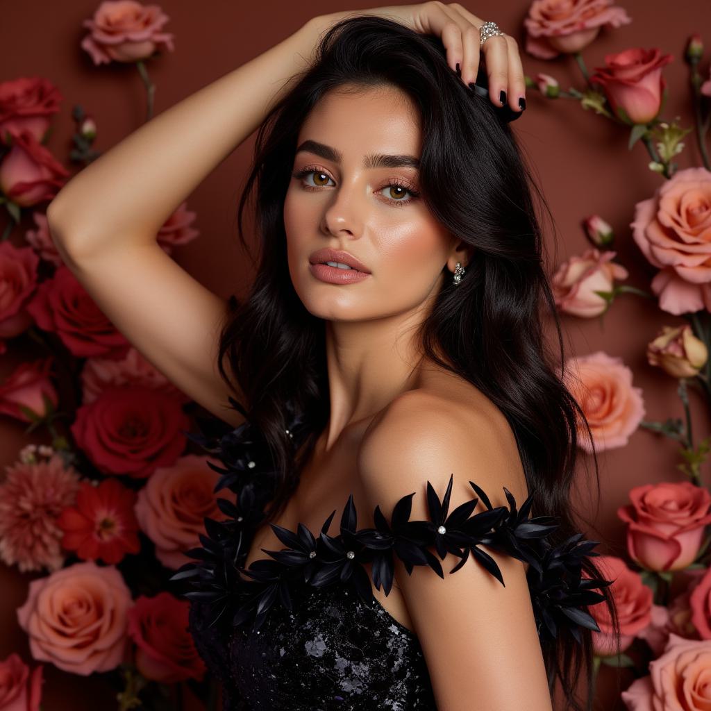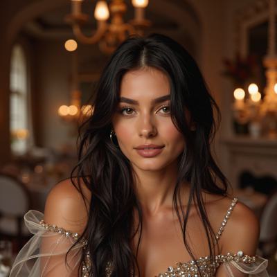 Молодая очень красивая девушка 40 лет модельной европейской внешности с очень красивыми длинными чёрными волосами и красивыми яркими губами в ослепительно красивом нарядном пышном модельном вечернем платье без декольте и очень красивых модельных туфельках на каблуках в полный рост на фоне красивой новогодней картинки сидит или лежит на очень красивом студийном кресле или диване.