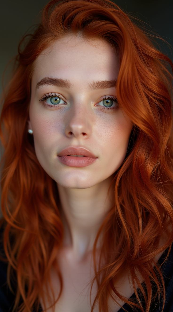 Максимально красивая, юная, очаровательная, загадочная, милая. нежная пятнадцатилетняя Красавица с длинными волнистыми рыжими волосами, ухоженными мягкими локонами. пристальный взгляд. Выразительные зелёные глаза с аккуратными стрелками и длинными ресницами. Пухлые чувственные губы приоткрыты. Густые брови. Светлая кожа, естественный макияж, красивые черты лица. Профессиональное фото на полнокадровую камеру DSLR, естественное освещение, высокая детализация, художественный фотопортрет.