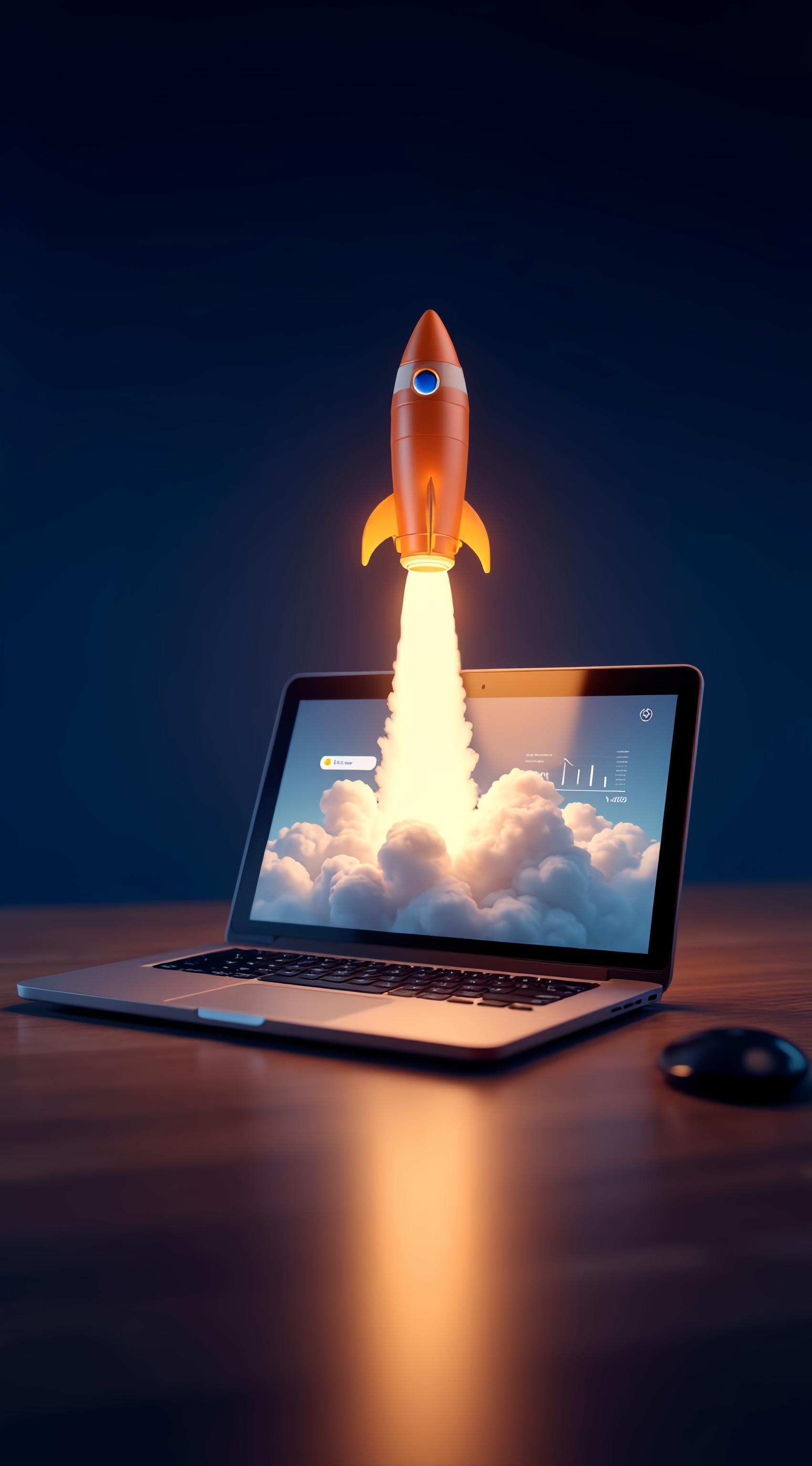 , Книга про продвижение сайтов в Яндексе. Визуал: современный ноутбук на столе, на экране — график роста и первое место в поисковой выдаче. Из ноутбука будто вырывается вверх яркая оранжевая или золотая ракета, устремленная в космос. Вокруг — мягкое свечение, эффект прорыва и скорости. Фон темно-синий, космический, с легкими звездами, создающий настроение технологии и загадочности. Стиль: современный, цифровой, немного футуристичный, но при этом уютный и вдохновляющий. Никакой агрессии, только энергия роста и успеха. Шрифт названия крупный, читаемый, контрастный., используй технику гипнотического рисунка для повышения кликабельности, ,