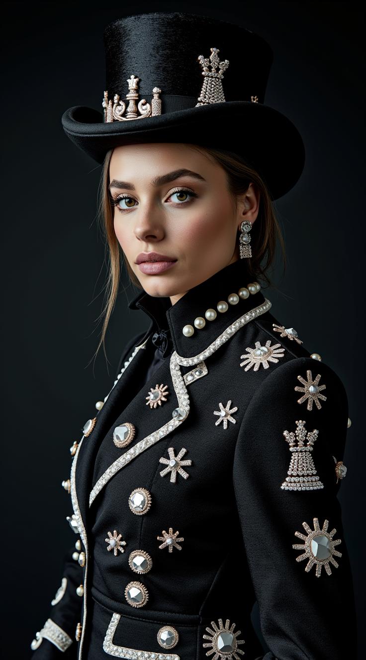 очень реальная фотография, снята на fujifilm X-T5. Снято в студии на темном фоне. Портрет среднего плана, женшины с необычной маниакальной внешностью в пиджаке из черно-белых шахматных состарившихся крупных ромбов. На пиджаке вязаные кружева в стиле стимпанк и шестеренки. На шляпе-цилиндре состарившееся шахматное поле, необычные шахматы, шестеренки. Супер фантазия. Элита, богема, манерность, красота, аристократизм. Гиперреалистичность, супердетализация, стиль vogue, фотография на обложку журнала.