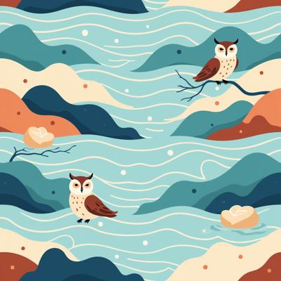 Бесшовный паттерн, термальный курорт, водный отдых. Стилизованные волнистые линии, пузырьки, абстрактные волны-горы и гладкие камни. Цветовая палитра: бирюзовый, бежевый, темно-синий, терракотовый акценты. Минимализм, плоская векторная иллюстрация, элегантный и спокойный дизайн для мерча. Стиль: современная графика, чистые линии, watercolor texture.