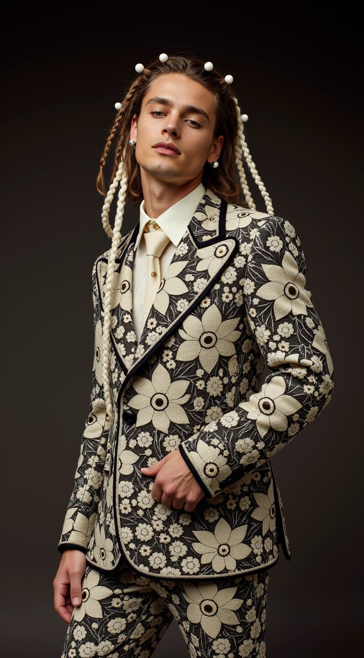 Очень реальная фотография, настоящая фотография, стиль vogue, портрет в полный рост, мужчина с бело-коричневыми косами, переплетёнными итальянскими кружевами, в замысловатом костюме из валяной шерсти, на костюме делирий, рисунки из белых причудливых фигур, шаров из белого расплавленного золота, спирали, взбитые сливки, кружева, сюрреализм. Нет макияжа. Задний фон четкий из скалы из белого известняка, студийное освещение. Супердетализация. Intricate