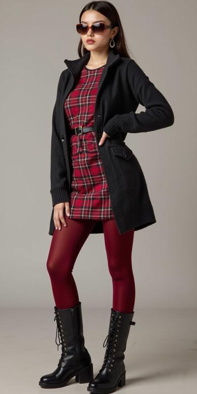Сделай мне несколько стилизованных образов для вечеринки. Идея такая: бордовое мини платье в клетку, бордовые колготки, ботинки ниже колена или ботфорты выше колена, кардиган серый дювыге талии или жакет черный. Используй цвета только : бордовый, серый, голубой, черный. Добавь аксессуары. А еще у меня будут черно-синие длинные и прямые волосы. Можно в один из вариантов добавить серые кружевные носки под ботинки ю. А еще добавь бордовую сумку