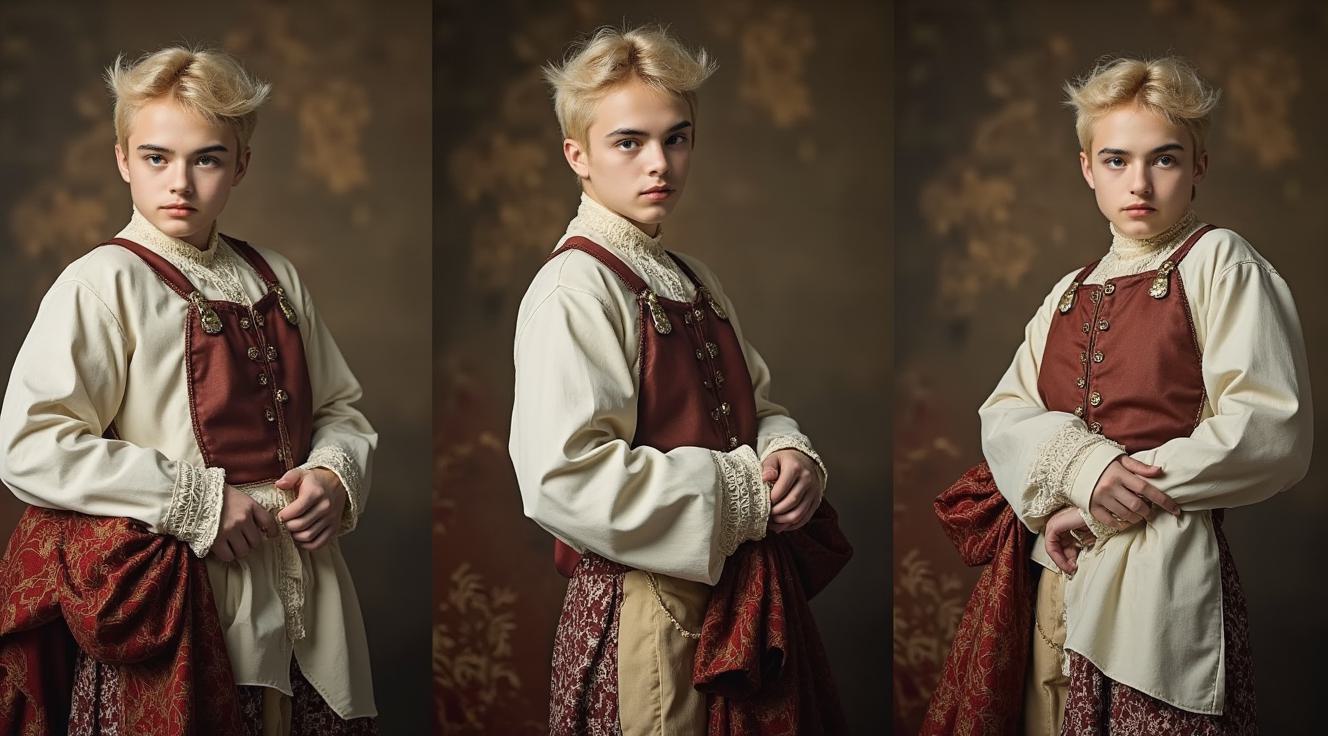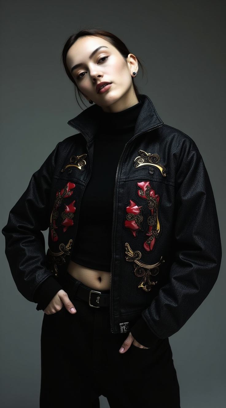 Вид в полный рост, люминесцентное искусство, поза, загадочная женщина с бледной кожей, черный головной убор, темный топ с высоким воротом, короткий жакет с рисунком и тремя вертикальными орнаментами - золотой, сверху; черный, посередине; красный,низ—подкладка из искусственной кожи,маленькие серьги,пристальный прямой взгляд, бархатистый темный фон, тонкая текстура ткани, спокойная сдержанная аура, утонченное загадочное присутствие, подчеркнутая минималистская элегантность, сверхдетализированный, полуреалистичный рендеринг