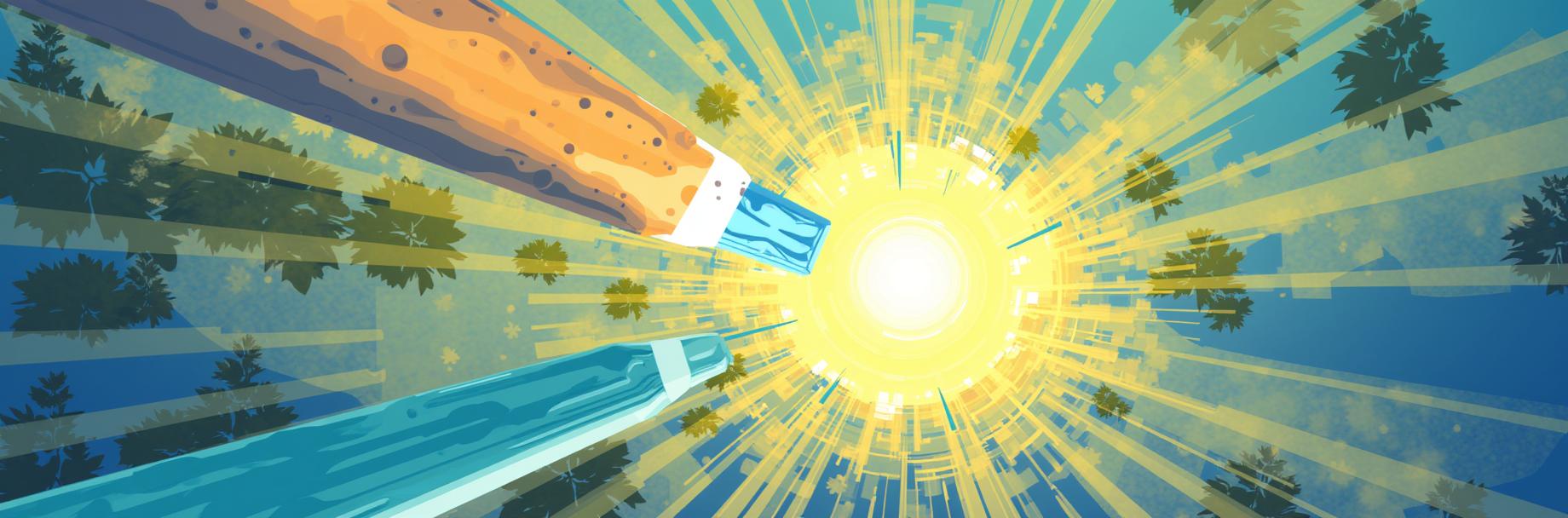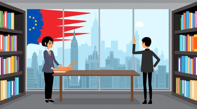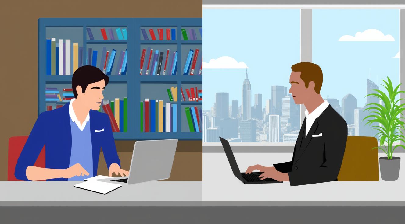 : Разделенный экран. На одной части: студент с ноутбуком в современной библиотеке иностранного университета (например, с американским или европейским флагом на заднем плане). На другой части: молодой специалист в деловом костюме, работающий в офисе с панорамным видом на мегаполис (например, Нью-Йорк, Лондон, Токио).
