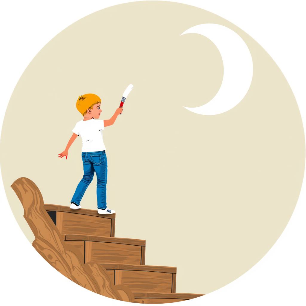 The picture is in a circle. A boy, white, 6 years old, with blond hair and a cheerful pose, stands with his back to the camera at the top of a wooden staircase. He was wearing a white T-shirt and blue jeans. An innocent image. The boy holds a brush and raises it to the sky to draw a white crescent-shaped cloud against the blue sky. Fluffy pink clouds contrast with the clear outlines of the painted cloud. The wooden staircase is brown in color, a strong vertical element that forms the basis for the stage. The light fills the stage with warmth. The composition is a creative act and a connection with the sky. Fabulous atmosphere, joyful mood. The lighting is bright and cheerful.