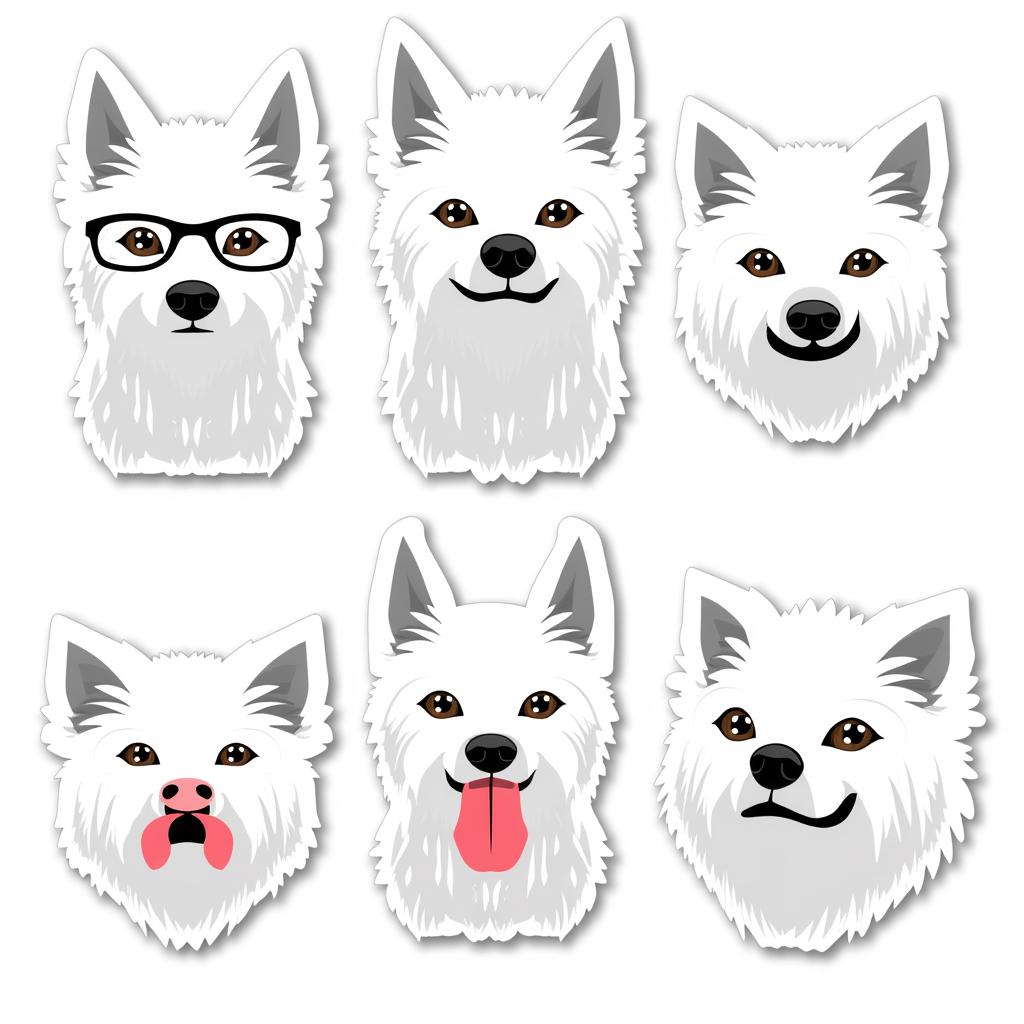 Нарисуй 6 стикеров мордочки собаки Вест Хайленд Уайт Терьер в мультяшном стиле. Пусть первый стикер будет в крутых очках, второй милый, третий в недоумении с вопросиками, четвертый радостый, а другие придумай сам. Пусть у каждой собачки будет высунут язычок. Сделай так, чтобы стикеры можно было легко вырезать
