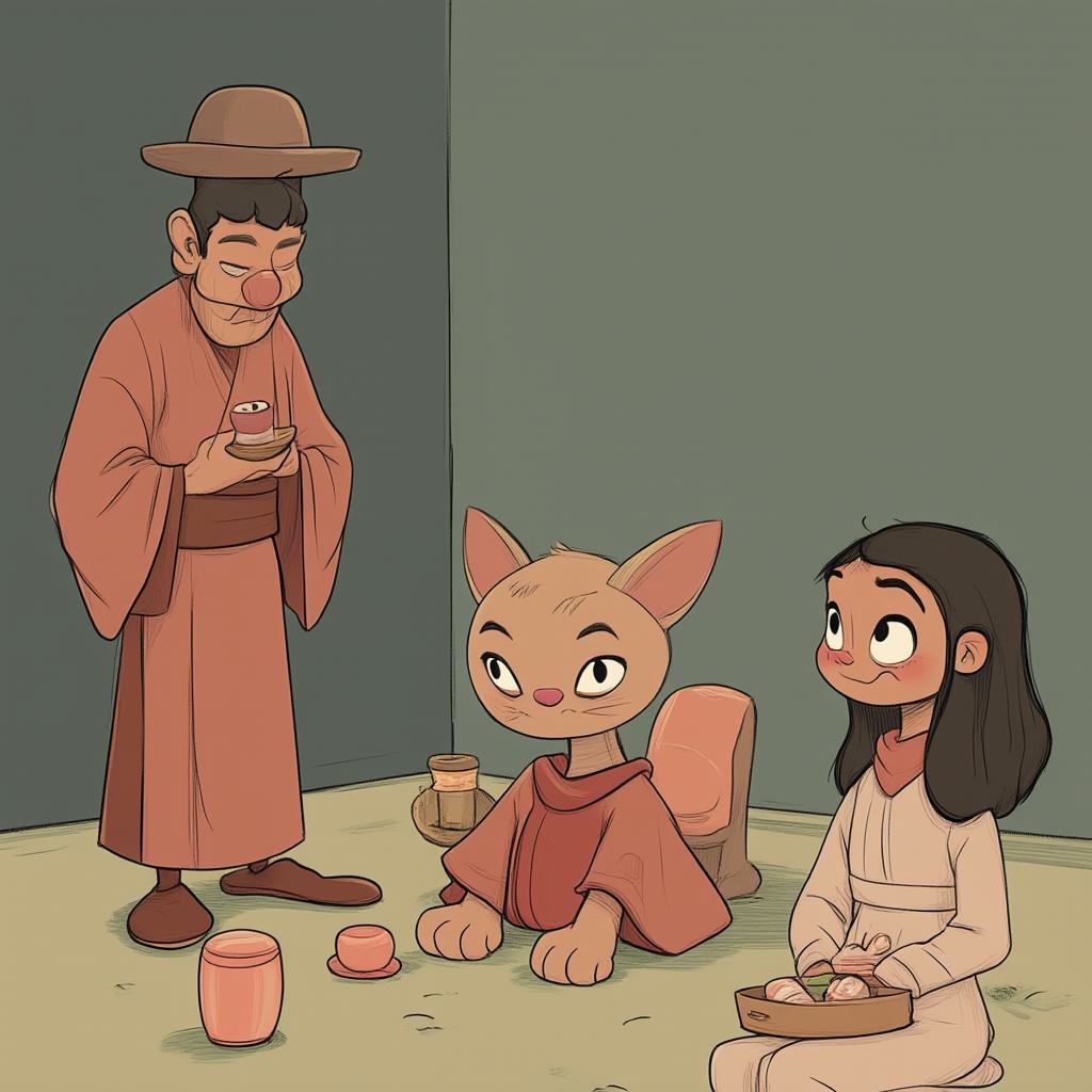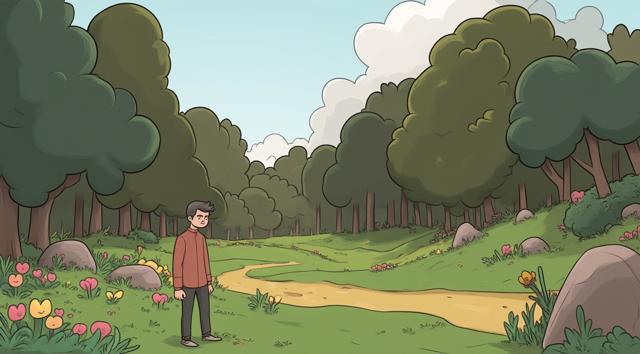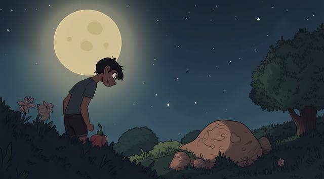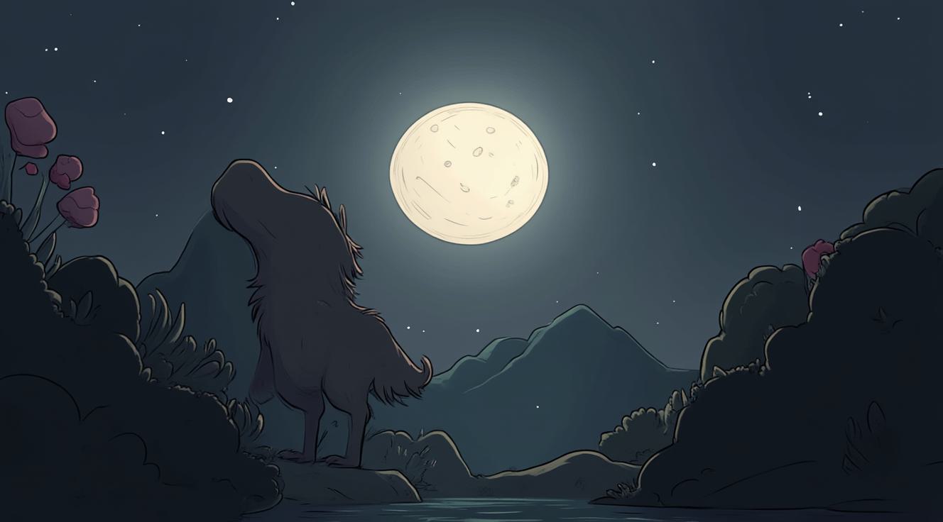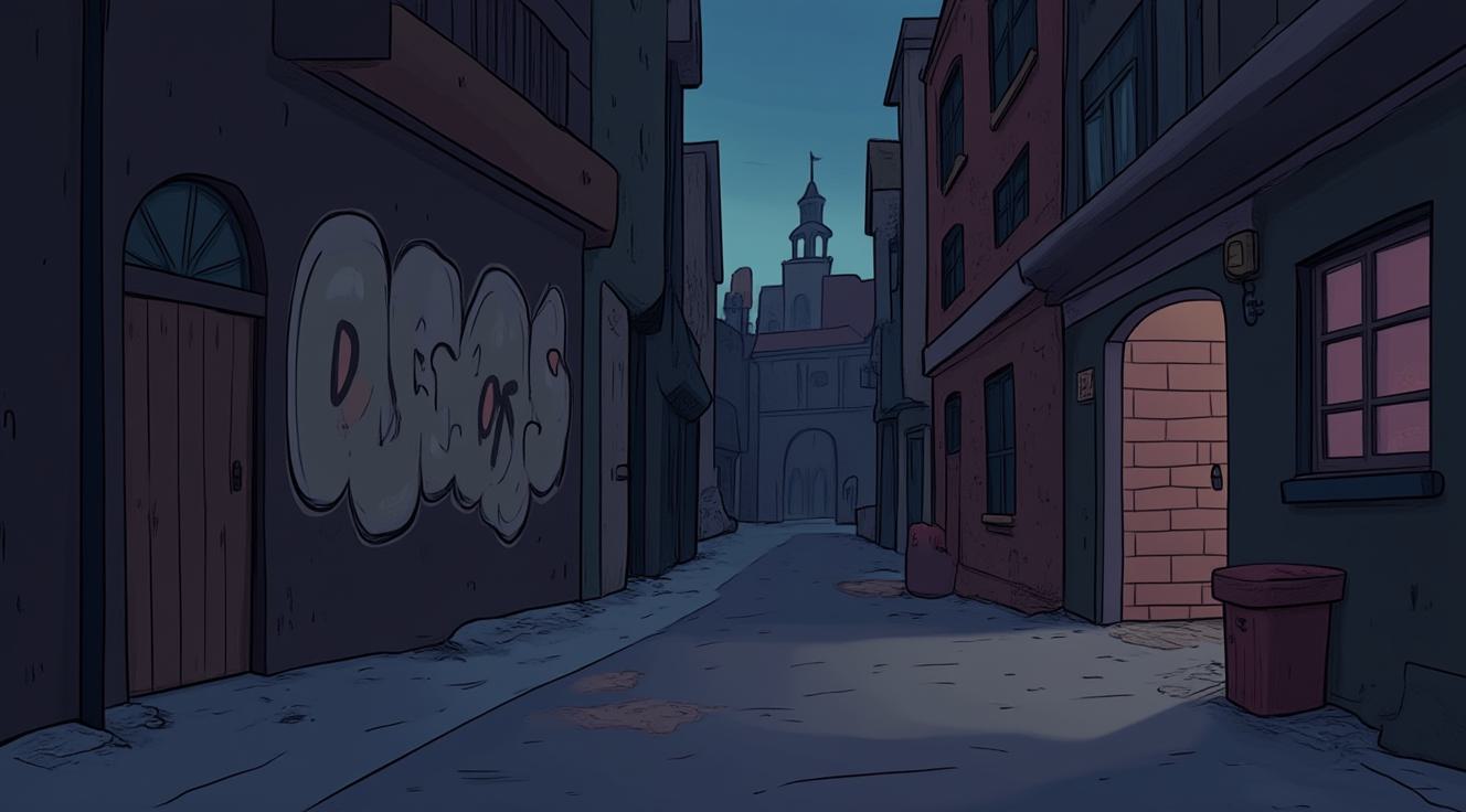 dark 2D cartoon background, night alleyway, flat cel shading, clean bold lineart, minimal detail, stylized wide-angle perspective, brick walls with simplified graffiti shapes, muted desaturated colors, dark blue and purple night palette, broken trash bins drawn in simple cartoon style, soft ambient night glow, subtle top light creating long shadows, low-key lighting, moody atmosphere, slightly exaggerated perspective lines, empty space in foreground, center of the image — a simple old carpet lying on the concrete floor, flat color fills, no texture realism, no 3D rendering, animated dark cartoon background style