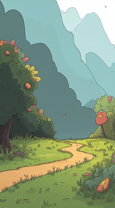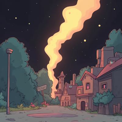 simple 2D cartoon background, flat shading, clean lineart, exaggerated wide-angle perspective, empty alleyway, brick walls with simplified graffiti shapes, broken trash bins drawn in minimal cartoon style, very low detail, no realistic textures, smooth color fills, soft cel-shading, stylized proportions, slightly curved perspective lines, center of the image — a simple patterned carpet lying on the ground, flat concrete floor, dark bluish night palette, animated TV cartoon background style, minimal lighting, soft glow from above, no photorealism, no high detail, no texture realism