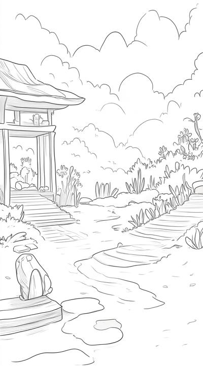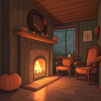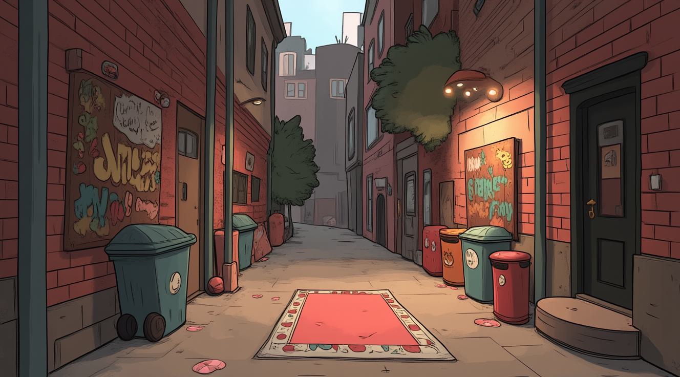2D animated stage-like composition, wide cinematic shot, slightly curved perspective lines, brick alley with heavy graffiti art, broken trash cans left and right, chain-link fence elements, soft overhead lights casting glow, empty urban courtyard feeling, old decorative carpet placed exactly in the center of the concrete floor, dramatic framing, foreground empty space, stylized cartoon shading, clean lineart, textured brush strokes, subtle night haze, animated film background quality