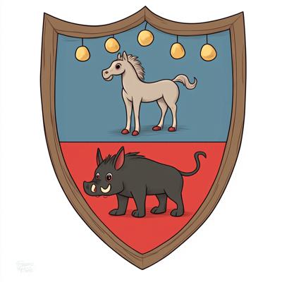 Создай герб старинной элитной академии в Ирландии. В центре щита разделённое на две части поле: в верхней части (на синем фоне) серебряная лошадь в движении (в стойке), в нижней части (на красном фоне) чёрный кабан с поднятым клыком. По верхнему краю щита дуга из маленьких золотых ирландских колокольчиков (Irish Bellflowers). Над щитом золотая корона с тремя зубцами, символизирующая многовековую историю. Герб выполнен в традиционном геральдическом стиле, с чёткими контурами и ограниченной цветовой палитрой (синий, красный, чёрный, золотой, серебряный). Дизайн компактный, симметричный, легко масштабируемый подходит для нанесения на униформу (плечо или грудь).