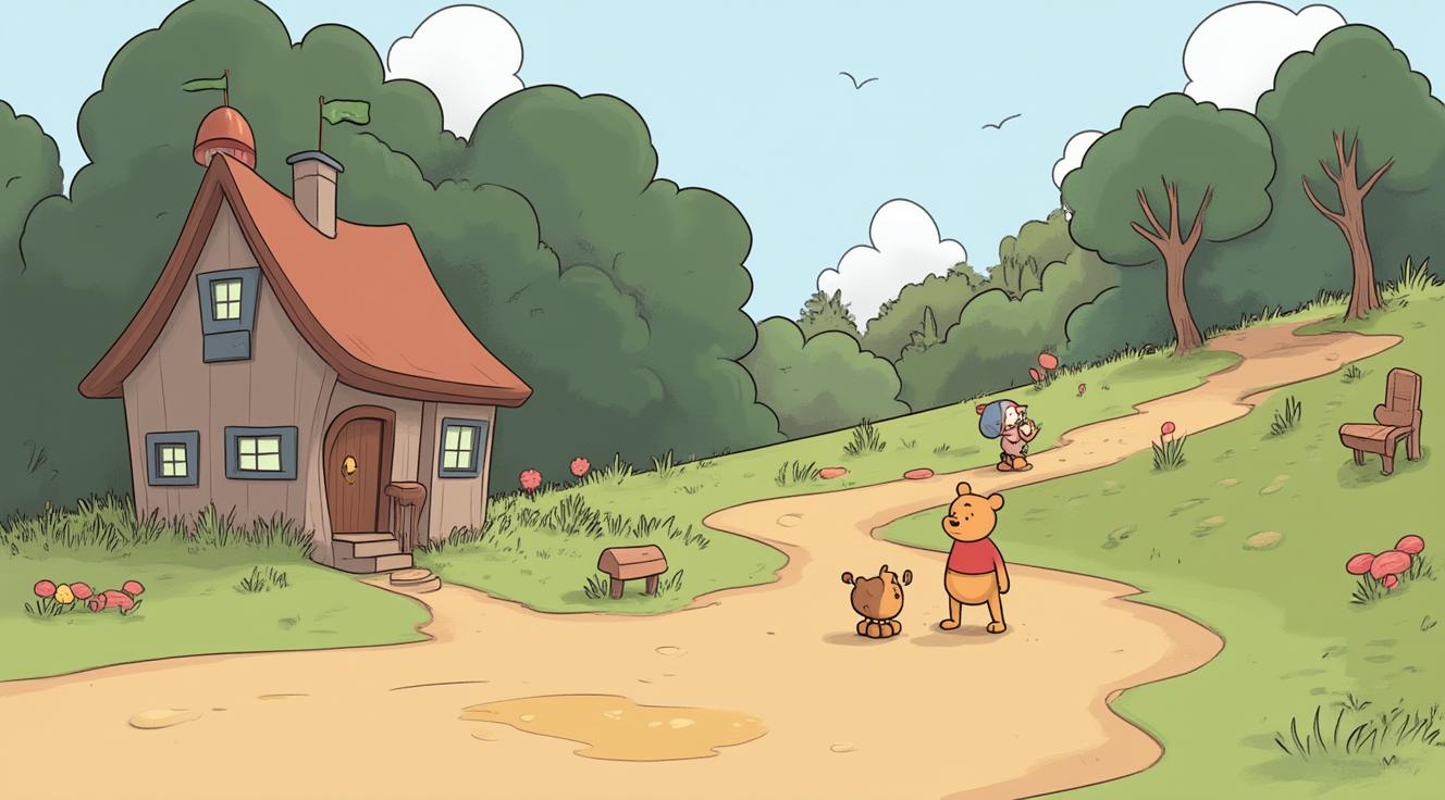 Сделай картинку в мультяшном стиле, формат а4 альбомная, к тексту : винипух ,, Шел и мед нашел., Желтый мед- мишке в рот., Довольный мишка до ушей, Пошел он в гости к другу., Пяточку, Пяточку., Там пили чай с малиной, И с вкусным медом., Счастливый вечерок!, Ок-ок., Провели они ОК! Оставь место для текста