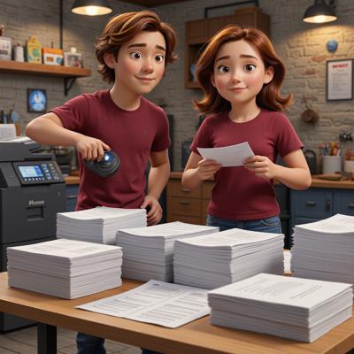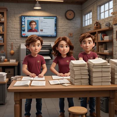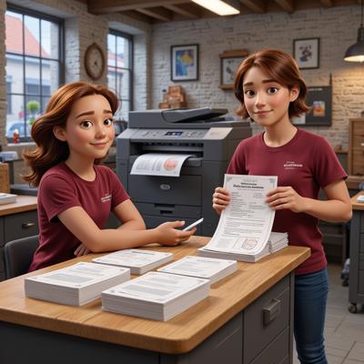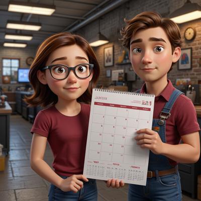 цех типографии, печатная машина печатает календари, сотрудница девушка в бордовой футболке с темными волосами и в очках с черной оправой держит в руках большой настенный календарь, улыбается, смотрит в кадр, другой сотрудник печатник парень с коричневыми волосами и голубыми глазами в бордовой футболке держит в руках стопку календарей