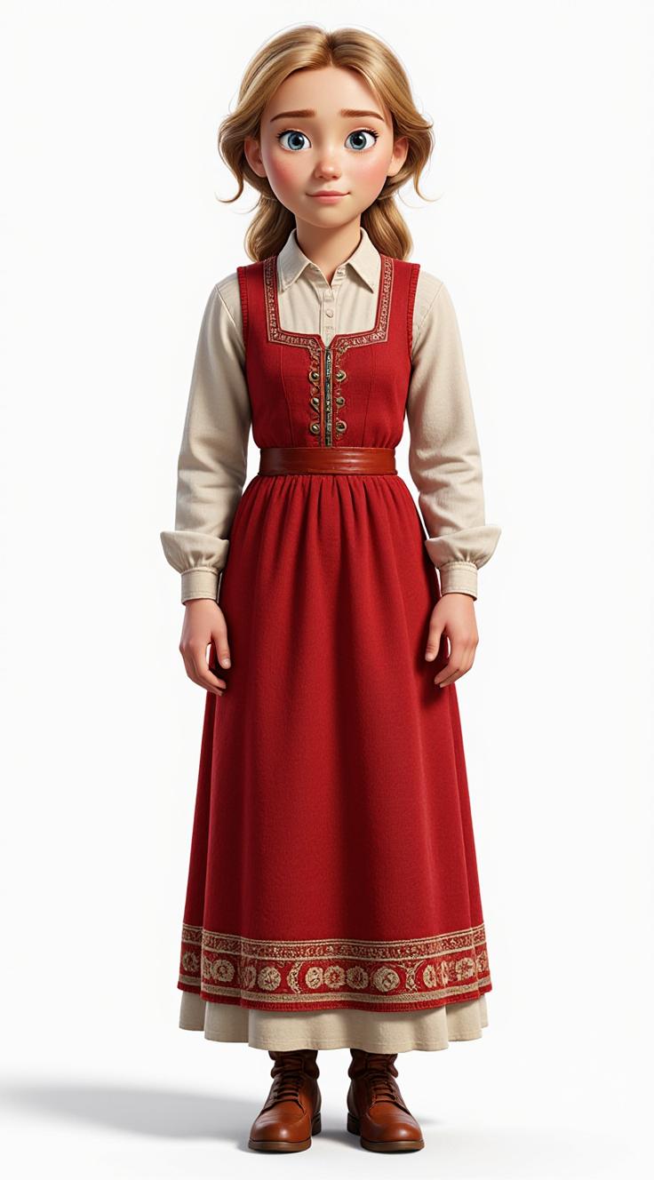full-body character, entire figure visible, strict front view, facing forward, standing straight, symmetrical pose, no angle or rotation. Young Slavic woman with light blonde hair and blue eyes. Neutral expression face. Wearing a traditional Russian folk sarafan: long ankle-length dress with wide skirt, straight silhouette, shoulder straps, vertical embroidery on front, decorative trim on hem, white long-sleeved blouse underneath. Strictly no headwear, no scarf, no kerchief, no wreath, hair fully visible.