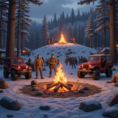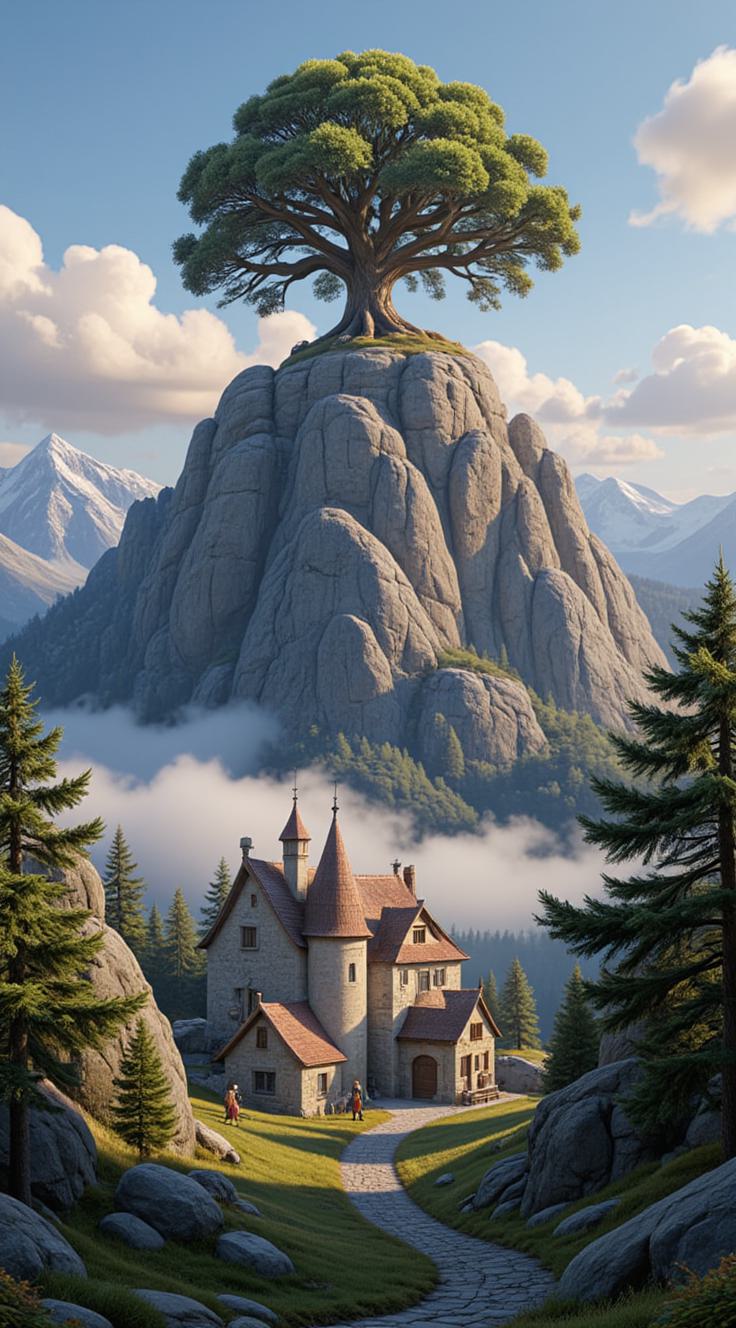 Сцена разделена по горизонтали: нижние 55% занимают склон горы, вид снизу (низкая точка обзора). Гора по центру экрана. На вершине горы стоит одно большое древнее дерево с широкой кроной, выразительный силуэт. У подножия горы — несколько небольших средневековых домиков, частично скрытых утренним туманом или лёгкой дымкой. Камера слегка снизу, создавая ощущение масштаба. Мягкий атмосферный свет, частично облачное небо, дальние горы. Чистый, детализированный фон в стиле игровой иллюстрации, без интерфейса.,