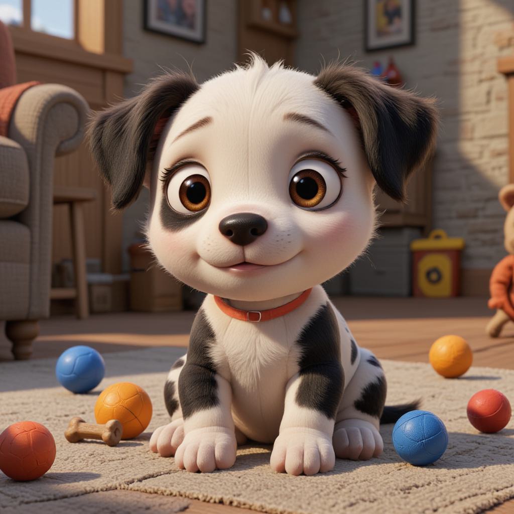 щенок, который играет в игрушки и рядом с ним разбросаны собачьи игрушки: мячики (разноцветные), мягкие игрушки и косточки. На фоне комната квартиры Щенок должен быть милый, добрый. Его окрас белый но нам нем есть черные пятна ( не как долматинец, скорее окрас похож на корову), Мордочка черная но белая полоска от лба до носа. Изображение должно выглядеть недетским. собака должна быть в таком же стиле Плод 5870895 - в таком же стиле