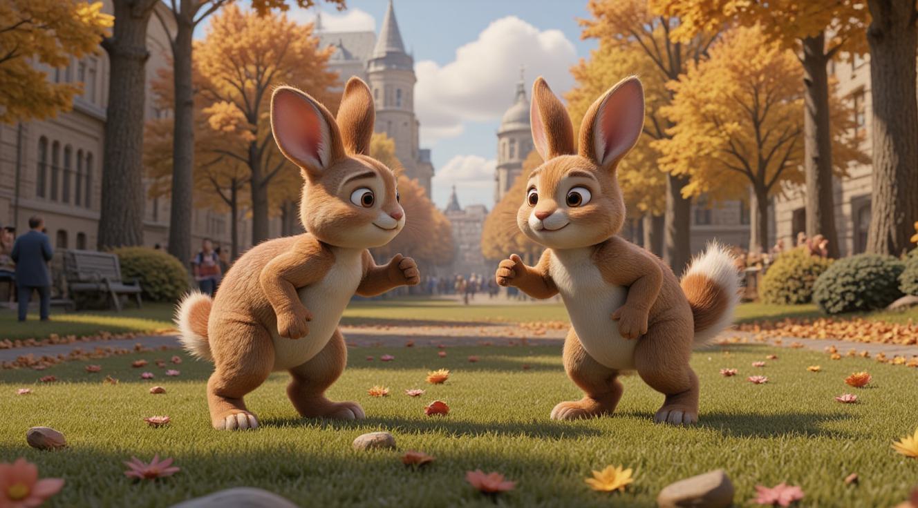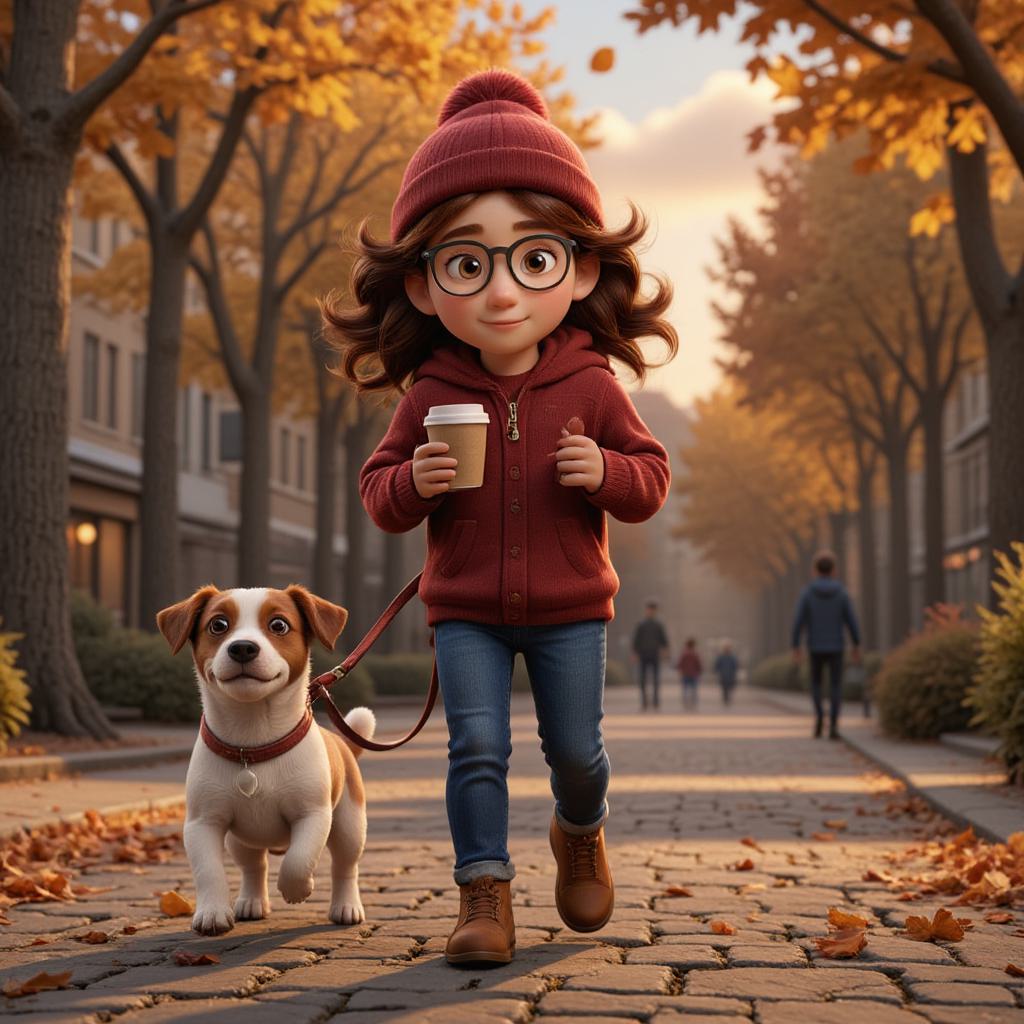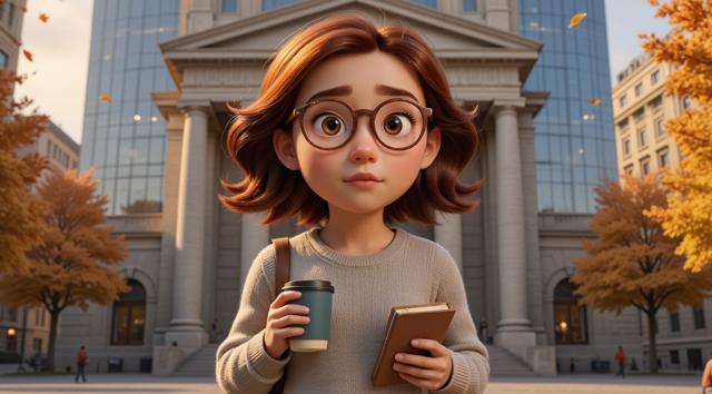 Девушка в больших круглых очках стоит перед современным зданием биржи, смотрит с лёгким удивлением и задумчивым любопытством. На ней свитер, в руках блокнот и кофе. Поза слегка неуверенная, но открытая. Здание внушительное, но не пугающее. Вокруг осенние листья. Мягкий свет заката, кинематографичная глубина, тёплая палитра: кремовый, бежевый, приглушённый зелёный, лёгкий янтарь.