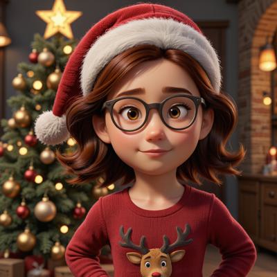 девушка в бордовом новогоднем свитере с оленями, в шапке санта клауса, с темными волосами, в очках в черной оправе, улыбается, вокруг атмосфера рождества и нового года, сказочно и красиво, новогодняя елка украшена золотыми и бордовыми новогодними шарами, золотая звезда на верхушке елки сияет ярко, падают красивые снежинки