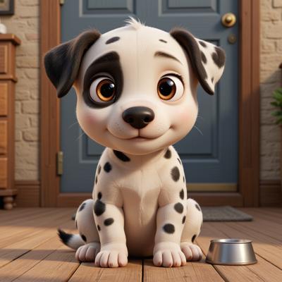 щенок, который сидит и рядом с ним миска. Щенок должен стоять на фоне домика. Щенок должен быть милый, добрый. Его окрас белый но нам нем есть черные пятна ( не как долматинец, скорее окрас похож на корову), Мордочка черная но белая полоска от лба до носа. Изображение должно выглядеть недетским. Плод 5870895 - в таком же стиле