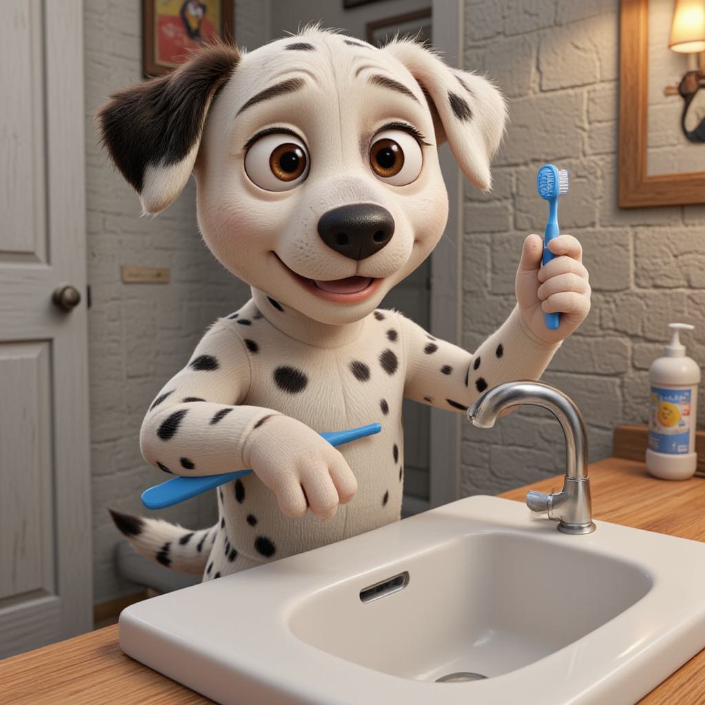 щенок стоит у раковины и чистит зубы щеткой одной лапой а во второй лапе держит зубную пасту. на заднем фоне ванная комната Его окрас белый но нам нем есть черные пятна ( не как долматинец, скорее окрас похож на корову), Мордочка черная но белая полоска от лба до носа. Изображение должно выглядеть недетским. Плод 5870895 - в таком же стиле