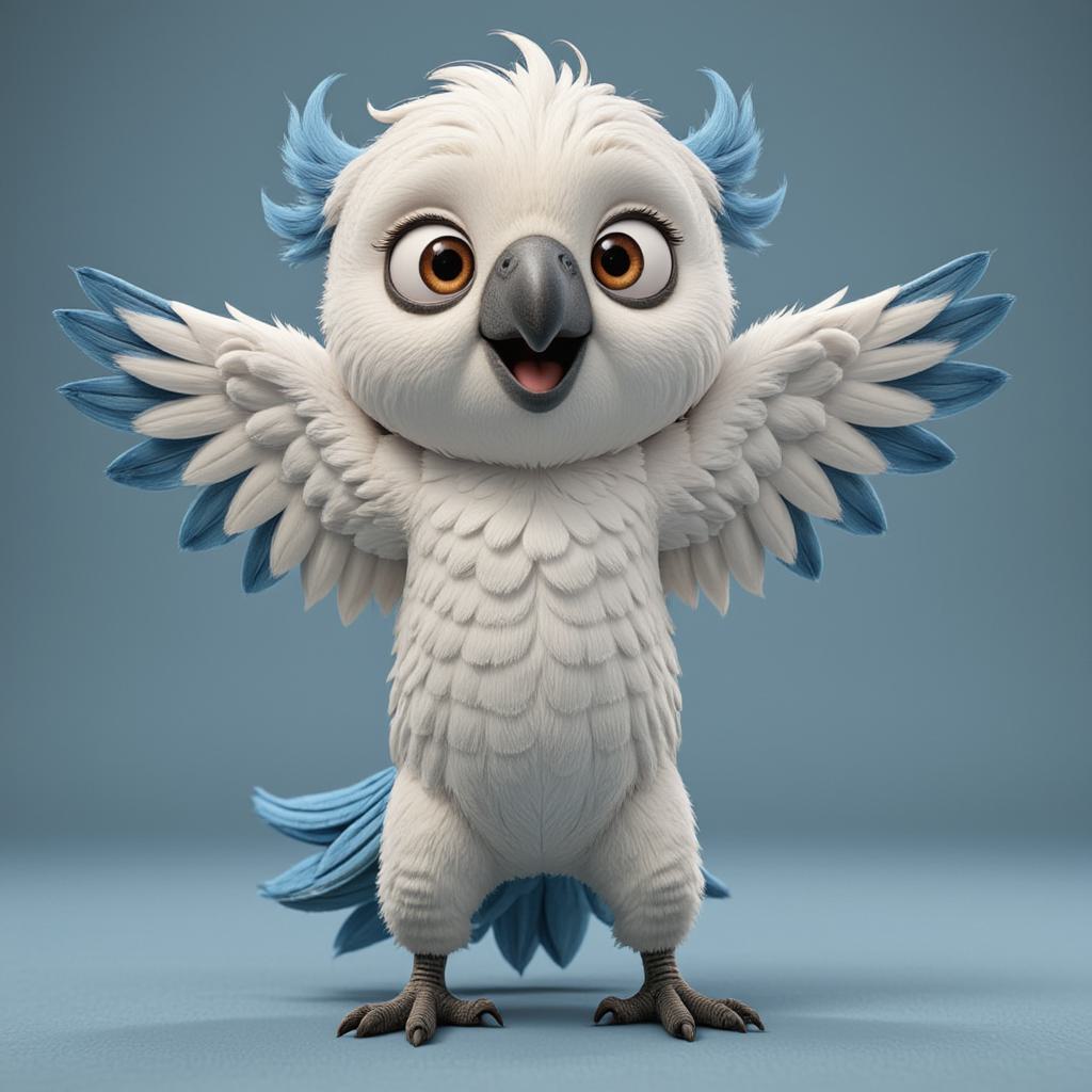 симпатичный антропоморфный попугай, Павел Ритор, талисман агентства по подготовке спикеров. Попугай умный и харизматичный. Его оперение в основном чистого белого цвета, с крыльями и хвостом элегантного нежно-голубого оттенка. Акцентные детали (например, обводка глаз, кончики перьев) — строгого черного цвета. Стиль современной векторной графики, 2D-персонаж, четкие линии, профессиональный и привлекательный. На чистом фоне.