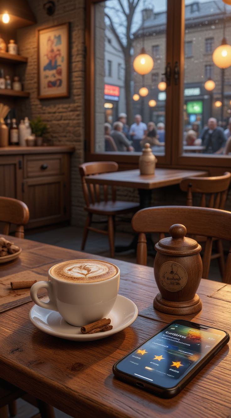 Фотографичная обложка книги. Тёплая, уютная атмосфера осеннего кафе. На деревянном столе — чашка кофе с корицей, рядом лежит смартфон. На экране телефона — открытый отзыв на Яндекс Картах, видны звёзды рейтинга и текст. На заднем плане — размытое окно с каплями дождя и мягкий свет уличных фонарей. Лёгкий пар поднимается над чашкой. Название книги крупно: «Кликни себя сам 2.0». Подзаголовок мельче: «Дневник человека, который перестал кликать и начал быть». Стиль: тёплый, уютный, вдохновляющий. Цветовая гамма: кофейные оттенки, золотистый, мягкий зелёный. Без людей.