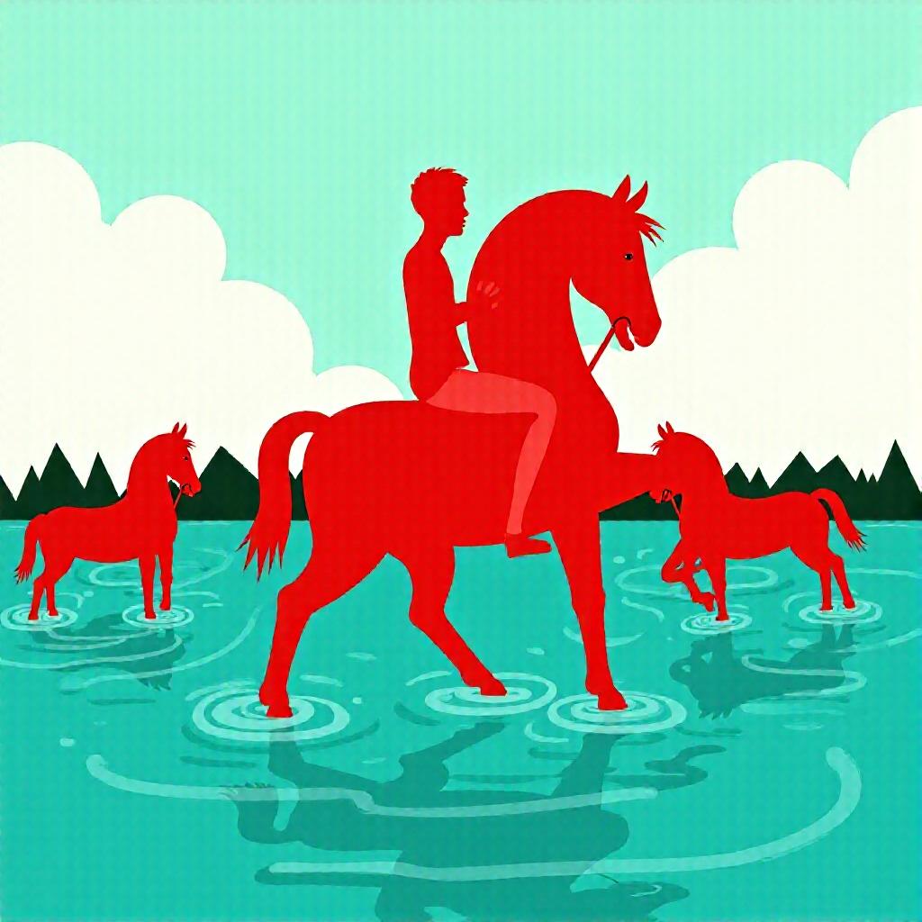 A symbolic painting in the spirit of Kuzma Petrov‑Vodkina: a majestic red horse in a lake, on which sits a rider in shorts. The horse reared. The color of the horse is bright scarlet, with blue-green shades of water, sky with clouds. Spherical perspective, flat image, clear silhouettes. Two more horses (white and reddish) are visible in the distance. heat. Style: modernism with elements of icon painting. Rich, pure colors, a minimum of semitones and high-quality graphics.