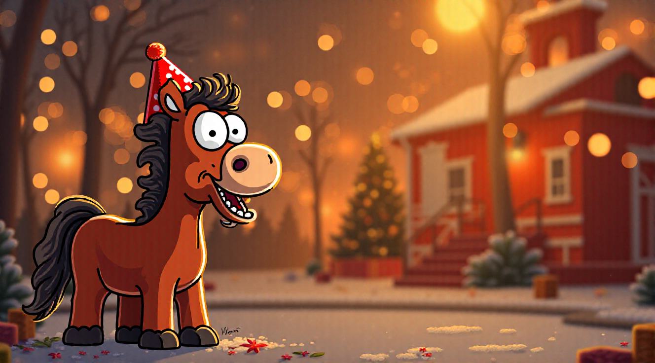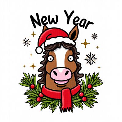 Создайте веселый и забавный принт для майки на новогоднюю тематику, в центре которого будет изображена лошадь в рождественском наряде. Лошадь должна быть одета в красный рождественский колпак и шарф, с веселым выражением лица. Добавьте к изображению элементы новогоднего декора, такие как гирлянды, снежинки и подарки, чтобы создать атмосферу праздника. Принт должен быть ярким, игривым и вызывать улыбку, идеально подходящим для новогоднего настроения.