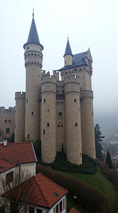 средневековый дворец в средневековом городе. дворец поражает своей высотой и стройностью. он как будто воздушный, тончайшие башни и резьба, красивейшие арки, множество архитектурных деталей, , вокруг дворца видно немного город, дома ниже чем дворец., , на изображении красивейшая, спокойная, умиротворяющая зима. в башенке дворца свет и видно два силуэта, атмосфера покоя и уюта