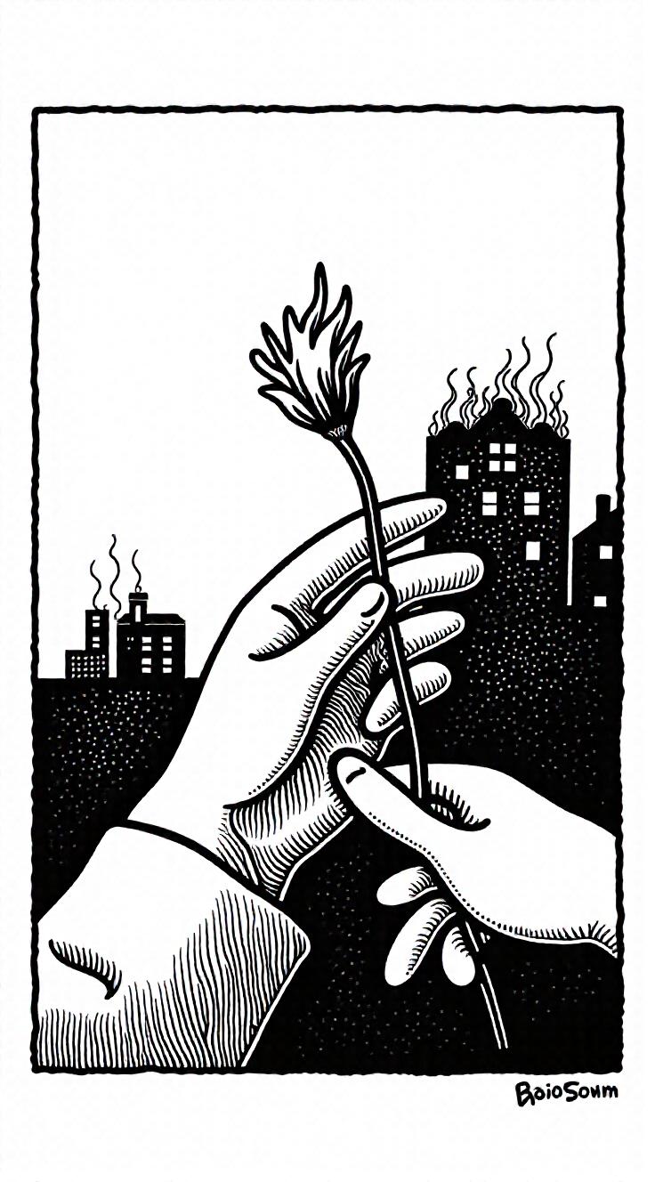 Символическая черно белая гравюра, разделённая на два плана. Драматический контраст близкого жеста и далёкого разрушения., Передний план:, Женская рука (тонкая, с изящными, но напряжёнными пальцами) держит цветок на стебле. Цветок горит. , Задний план: силуэты горящих домов. Не детальные, а размытые, как кошмар обрушенные крыши, остовы башен., Высококонтрастная гравюра. Только чистый чёрный, белый и агрессивная штриховка.
