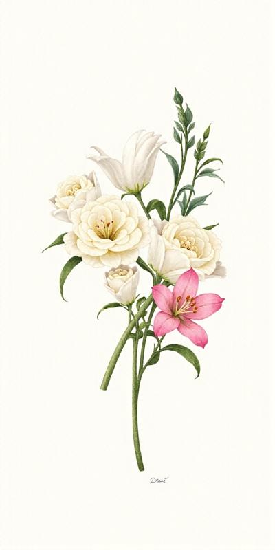 Изысканный нежный букет из белых эустом (лизиантусов) и розовых лилий. В композиции присутствуют розы сорта 'Мадам Бомбастик' кремово-белого цвета, добавляющие шик и объем. Зелень рускуса и эвкалипта. Пастельная цветовая гамма, мягкий фокус, натуральное освещение, акварельный стиль с детальной проработкой лепестков, эстетика романтики и нежности, букет для особого подарка, высокое разрешение