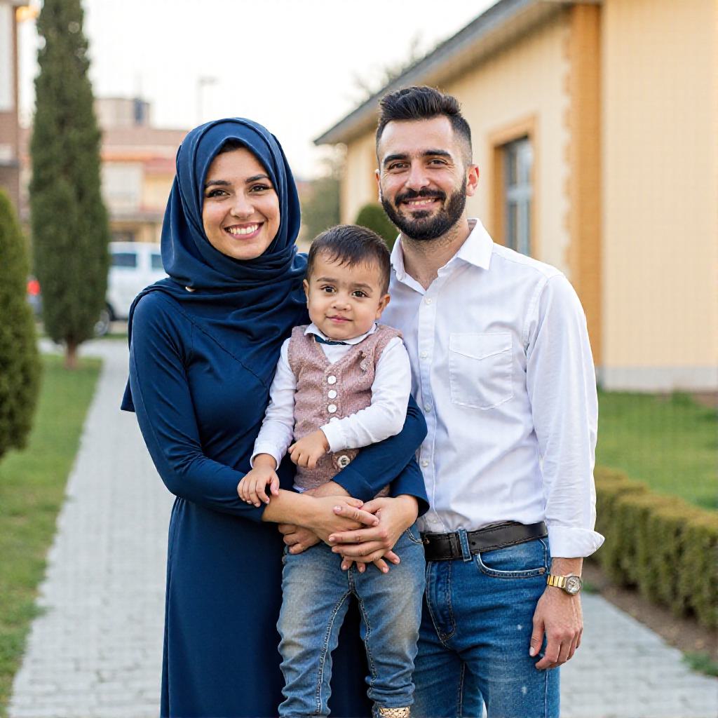 Family photo of an attractive and happy Azerbaijani family with three children, the son standing between his parents, posing for the camera, in full growth. Eastern style of clothing, the mother wearing a hijab and a long blue dress, the father wearing a white shirt and blue jeans, the 12-year-old son wearing a beige shirt, dark trousers, and a dark blue blazer, the 20-year-old daughter wearing an Eastern-style hijab, the 18-year-old daughter wearing a hijab and a brown cardigan, all dressed by a designer. A joyful mood, a family portrait, they are posing in front of the camera, the photo was taken with a canon eos r5 f2 iso30 -ar 117:128