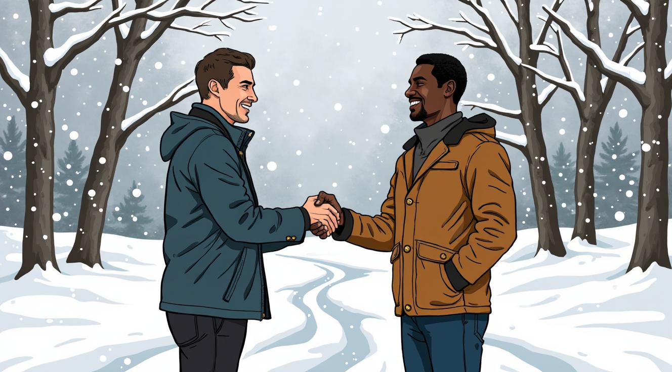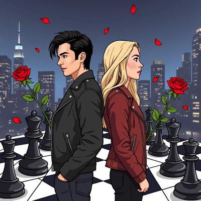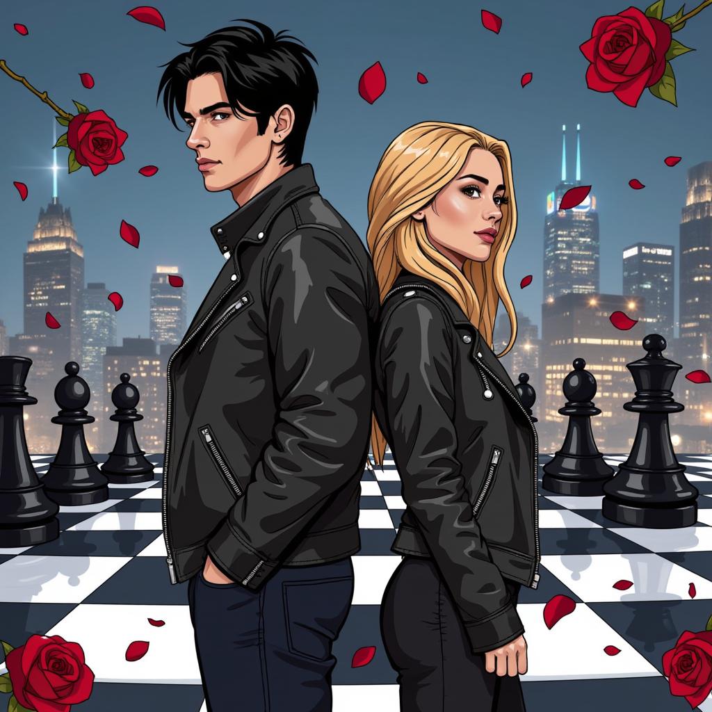 красивый парень с черными волосами похожий на Билла Скасгарда в кожаной куртке и девушка блондинка с длинными волосами, смотрят в сторону, стоят боком спина к спине, стоят на огромной шахматной доске, фон высотки ночного города и огромные черные шахматные фигуры, алые розы, лепестки роз в воздухе,переливающиеся холодные тона, Иллюстрация, реализм, высокая детализация
