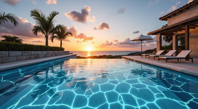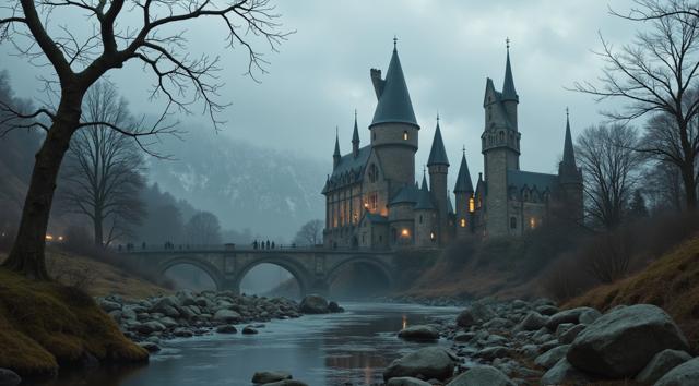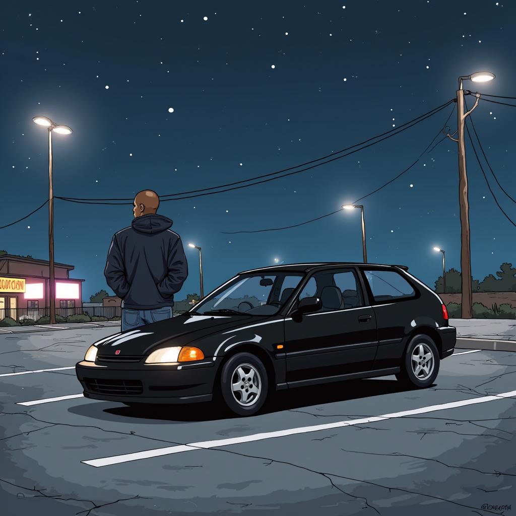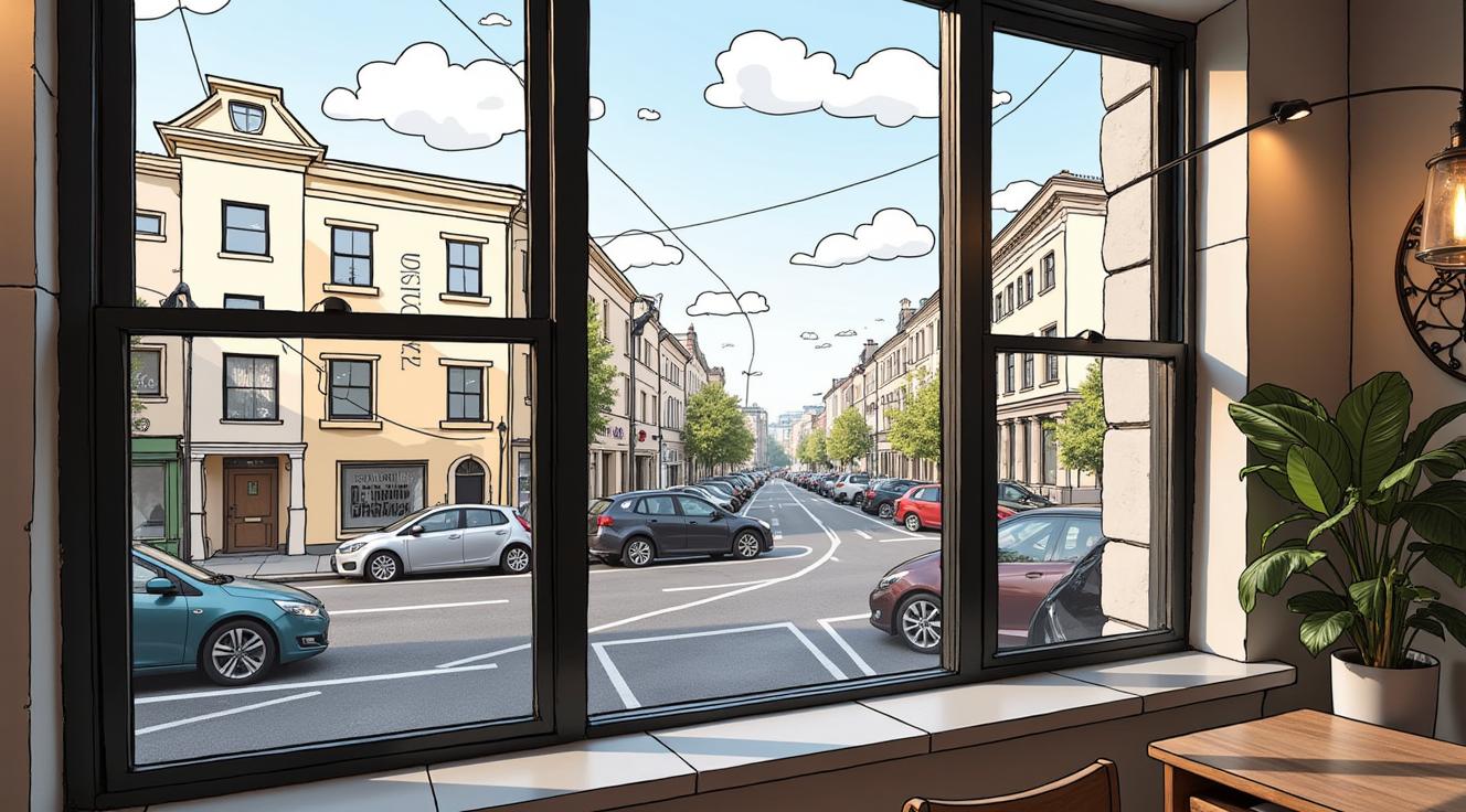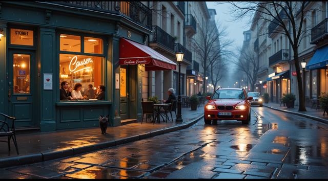 A quiet alley in a city, wet from the rain. A small café sits on the corner, with a few people sitting by the window, their faces lit by warm light. The cobblestone street is slick with puddles, reflecting the soft glow of streetlights and the headlights of an approaching car. A cat is curled up in a doorway, resting peacefully